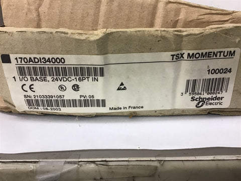 TSX Momentum 170AD134000 I/O Base 24 VDC 16 PT Return Policy Returns accepted within 30 days. Items sold as is cannot be returned, unless description is in error. Buyer pays return freight. Shipping Policy We ship almost all items with 1 business day of cleared payment. We ship USPS and UPS. We can ship on your account. If you will be shipping freight, please be sure to provide all delivery contact information including a phone number. We will need to know if you have a fork lift or dock.