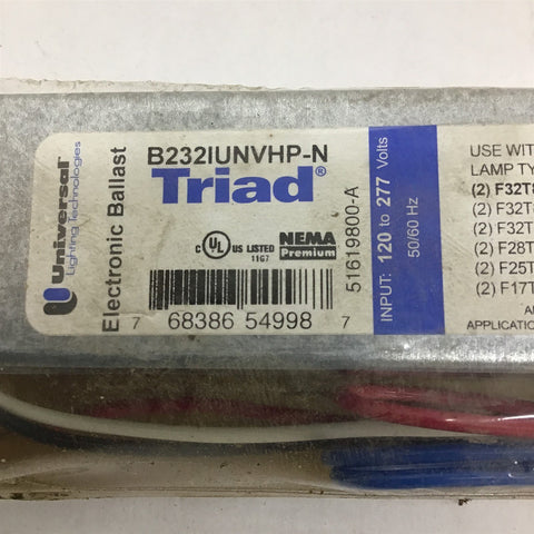 Universal B232IUNVHP-N Triad Electronic Ballast Return Policy Returns accepted within 30 days. Items sold as is cannot be returned, unless description is in error. Buyer pays return freight. Shipping Policy We ship almost all items with 1 business day of cleared payment. We ship USPS and UPS. We can ship on your account. If you will be shipping freight, please be sure to provide all delivery contact information including a phone number. We will need to know if you have a fork lift or dock.