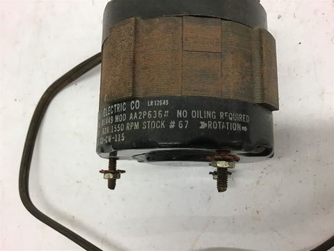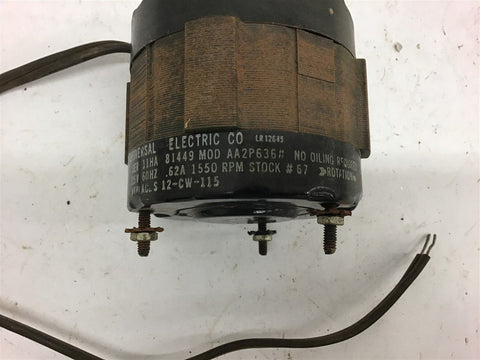 Universal Electric AA29636# Motor .62A 1550 Rpm 115 Volts Return Policy Returns accepted within 30 days. Items sold as is cannot be returned, unless description is in error. Buyer pays return freight. Shipping Policy We ship almost all items with 1 business day of cleared payment. We ship USPS and UPS. We can ship on your account. If you will be shipping freight, please be sure to provide all delivery contact information including a phone number. We will need to know if you have a fork lift or dock.