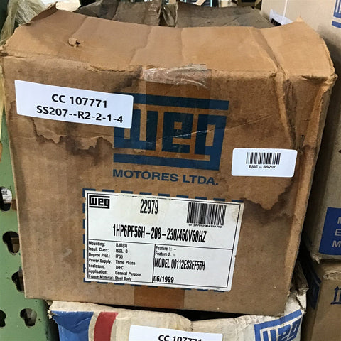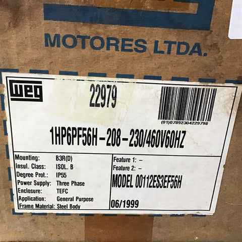 Weg 00112ES3EF56H 1 HP AC Motor 208-230/460 V 3 Phase 6P 1200 Rpm 56H Frame Return Policy Returns accepted within 30 days. Items sold as is cannot be returned, unless description is in error. Buyer pays return freight. Shipping Policy We ship almost all items with 1 business day of cleared payment. We ship USPS and UPS. We can ship on your account. If you will be shipping freight, please be sure to provide all delivery contact information including a phone number. We will need to know if you have a fork lift or dock.