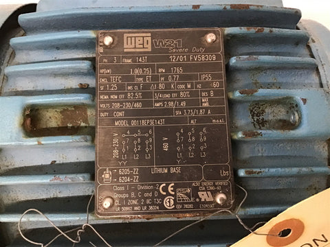 Weg 00118EP3E143T 1HP 208-230/460V 1800 RPM 4P 143T 3PH 60HZ TEFC AC Motor Return Policy Returns accepted within 30 days. Items sold as is cannot be returned, unless description is in error. Buyer pays return freight. Shipping Policy We ship almost all items with 1 business day of cleared payment. We ship USPS and UPS. We can ship on your account. If you will be shipping freight, please be sure to provide all delivery contact information including a phone number. We will need to know if you have a fork lift or dock.