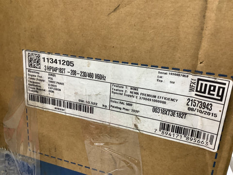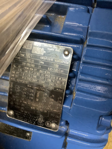 Weg 00318XT3E182T AC Motor 3 Hp 208-230/460 V 1760 Rpm 2P Fr 182T 3 Ph 60 Hz Return Policy Returns accepted within 30 days. Items sold as is cannot be returned, unless description is in error. Buyer pays return freight. Shipping Policy We ship almost all items with 1 business day of cleared payment. We ship USPS and UPS. We can ship on your account. If you will be shipping freight, please be sure to provide all delivery contact information including a phone number. We will need to know if you have a fork lift or dock.