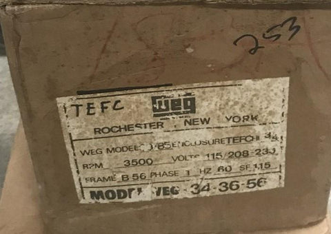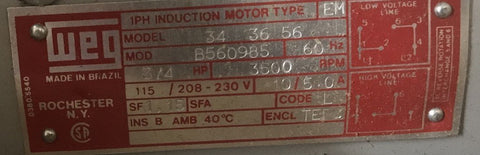WEG 34-36-56 MOTOR TEFC ENC 3/4HP 3500RPM 115/208-230V B-56FR 1PH 60HZ 115SF