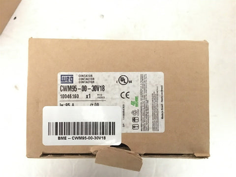 WEG CWM95-00-30V18 Cntactr, 3-P N/O, 120VAC, 95A No Aux Con 30HP@230V/60HP@460V Return Policy Returns accepted within 30 days. Items sold as is cannot be returned, unless description is in error. Buyer pays return freight. Shipping Policy We ship almost all items with 1 business day of cleared payment. We ship USPS and UPS. We can ship on your account. If you will be shipping freight, please be sure to provide all delivery contact information including a phone number. We will need to know if you have a fork lift or dock.