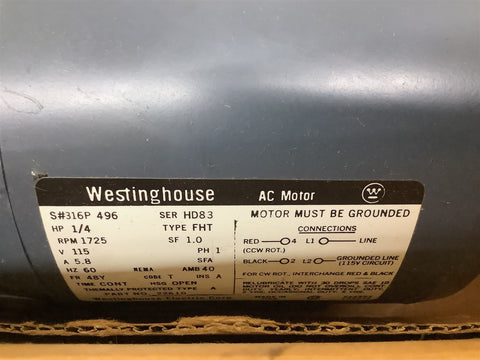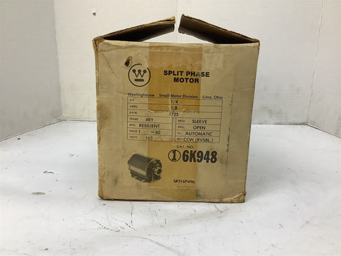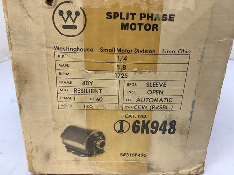 Westinghouse 6K948 AC Motor 1/4HP 115V 1725RPM 48YF 5.8AMP 60HZ Return Policy Returns accepted within 30 days. Items sold as is cannot be returned, unless description is in error. Buyer pays return freight. Shipping Policy We ship almost all items with 1 business day of cleared payment. We ship USPS and UPS. We can ship on your account. If you will be shipping freight, please be sure to provide all delivery contact information including a phone number. We will need to know if you have a fork lift or dock.