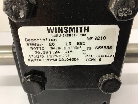 Winsmith 920MWN20LR56C 20:1 Ratio Gear Reducer 1.04 Input HP Return Policy Returns accepted within 30 days. Items sold as is cannot be returned, unless description is in error. Buyer pays return freight. Shipping Policy We ship almost all items with 1 business day of cleared payment. We ship USPS and UPS. We can ship on your account. If you will be shipping freight, please be sure to provide all delivery contact information including a phone number. We will need to know if you have a fork lift or dock.